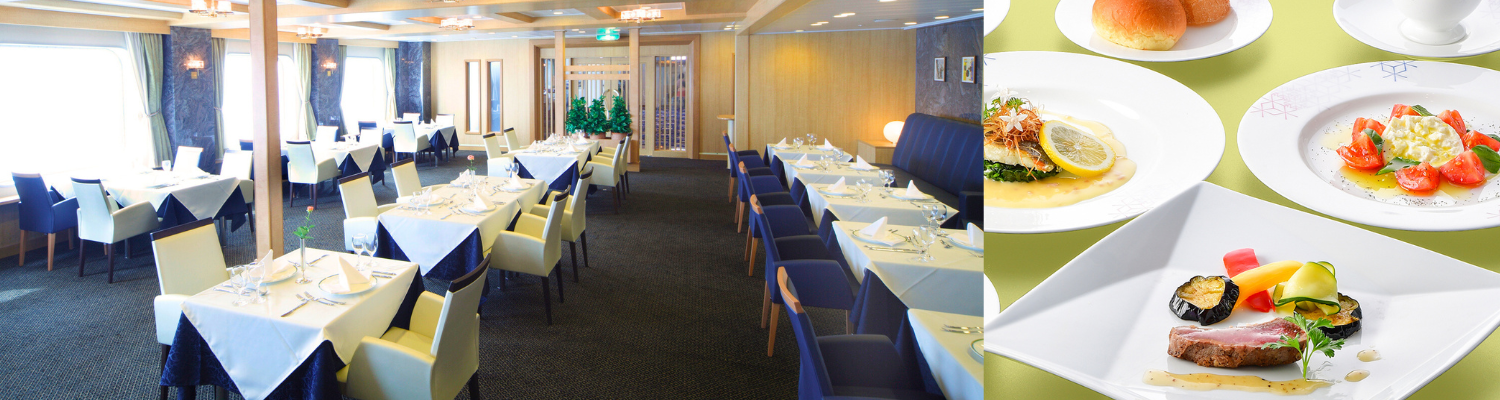 レストランではカフェテリアやセットメニュー形式にて北海道ならではの食材を利用した料理を取り揃えております。また、夏季は後部デッキでバーベキューガーデンをオープンしています。爽快な青空と日本海の大海原のもと、ご家族やグループでわいわいお楽しみください。