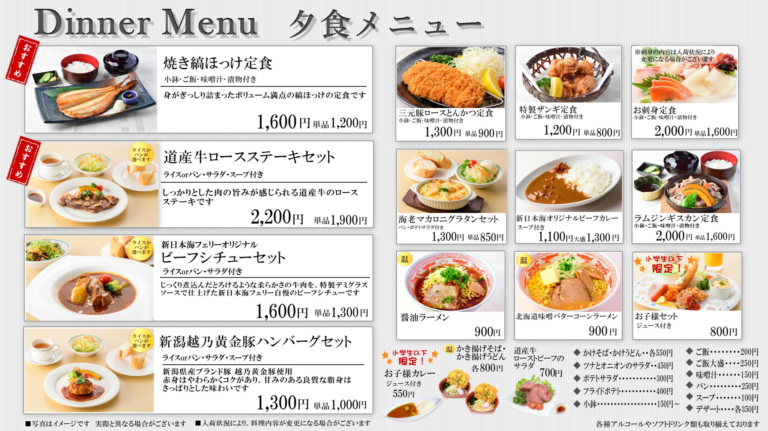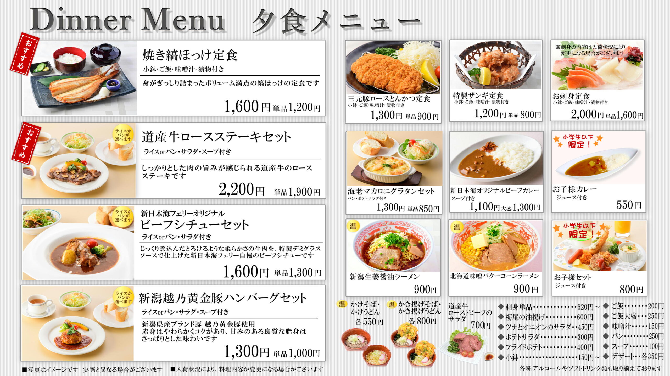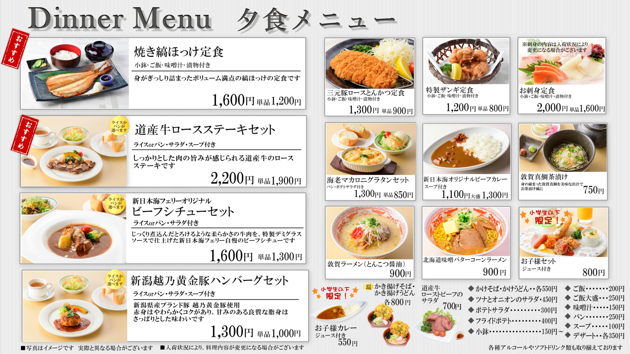 レストラン 2020/3/15 2023/5/16 ホーム 海を眺めながら、ゆったりとした時間の流れのなか、船上でのお食事をお楽しみください。 らべんだあ・あざれあ・すずらん・すいせん・はまなす・あかしあでは タブレットによるセルフオーダーシステム・セルフレジを導入しました! ご利用方法は>>こちら 船内レストランのお支払い方法については>>こちら あかしあ・はまなす舞鶴~小樽航路 あかしあ・はまなすのレストランメニューです! 〇朝食メニュー 〇昼食メニュー 〇夕食メニュー らべんだあ・あざれあ新潟~小樽航路 らべんだあ・あざれあのレストランメニューです! 〇朝食メニュー 〇昼食メニュー 〇夕食メニュー らいらっく・ゆうかり敦賀~新潟~秋田~苫小牧航路 らいらっく・ゆうかりのレストランメニューです! 〇朝食メニュー 〇昼食メニュー 〇夕食メニュー すずらん・すいせん敦賀~苫小牧航路 すずらん・すいせんのレストランメニューです! 〇朝食メニュー 〇昼食メニュー 〇夕食メニュー アルコールメニュー 生ビール(キリン一番搾り)中ジョッキ 700円 瓶ビール 750円 日本酒(銚子瓶) 180ml 500円~ ワイン(ハーフボトル) 1,200円~ その他、焼酎、ウイスキー等各種アルコールやソフトドリンク類も取り揃えております。 ※写真は全てイメージです。 ※価格は全て税込です。 ※お食事形式・メニュー内容は変更になる場合がございます。 ※航路によりお食事形式・メニュー内容は異なる場合がございます。 グリルへ カフェへ
