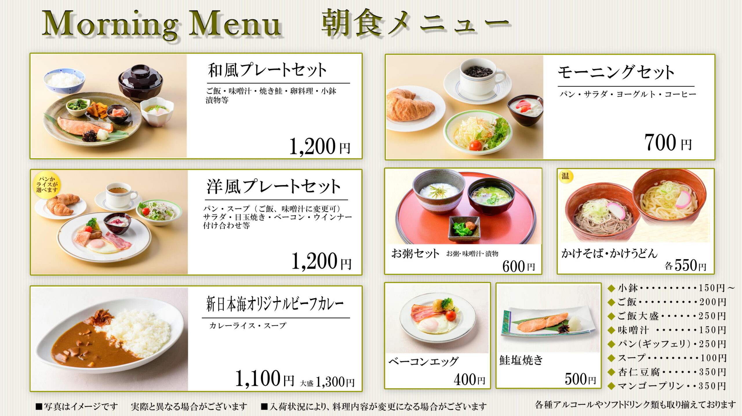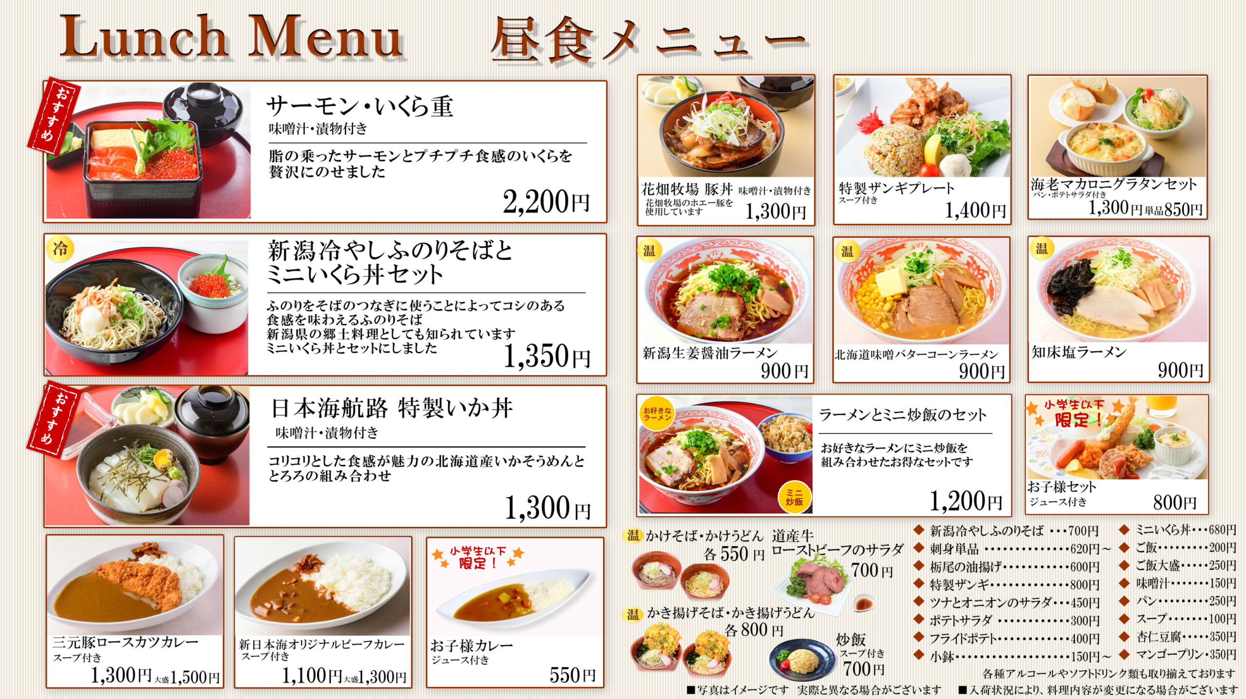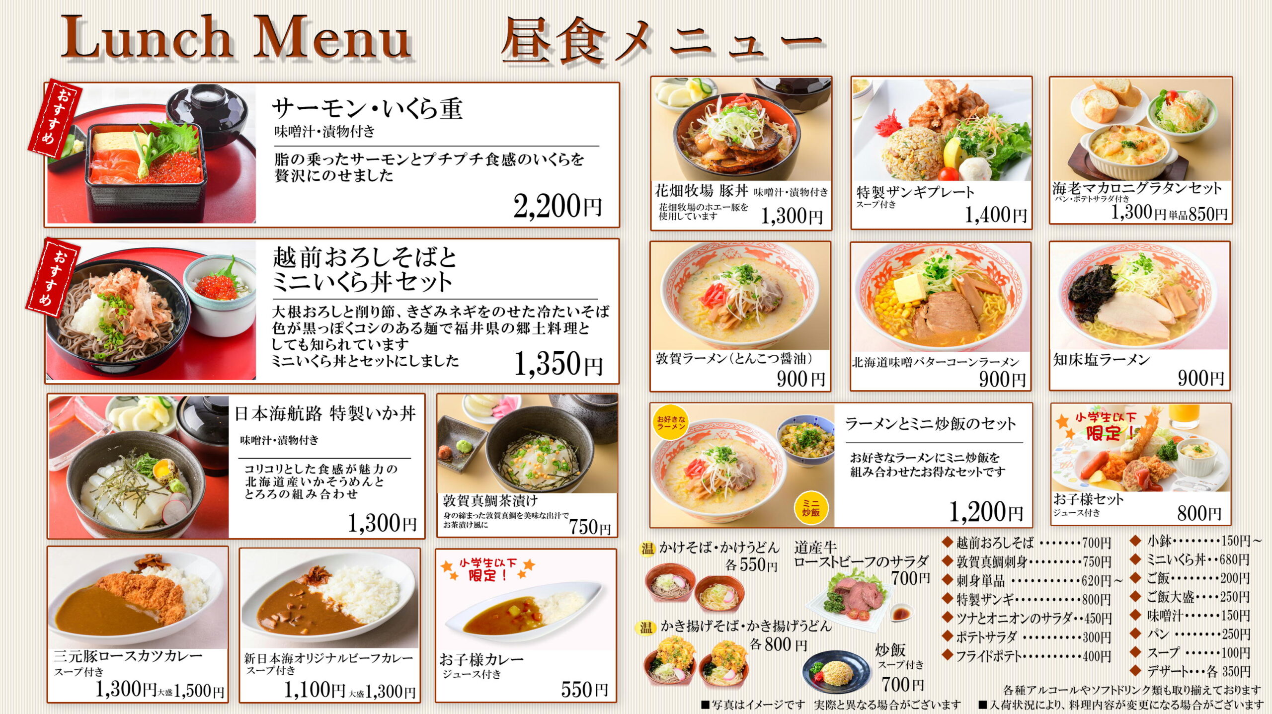 レストラン 2020/3/15 2023/5/16 ホーム 海を眺めながら、ゆったりとした時間の流れのなか、船上でのお食事をお楽しみください。 らべんだあ・あざれあ・すずらん・すいせん・はまなす・あかしあでは タブレットによるセルフオーダーシステム・セルフレジを導入しました! ご利用方法は>>こちら 船内レストランのお支払い方法については>>こちら あかしあ・はまなす舞鶴~小樽航路 あかしあ・はまなすのレストランメニューです! 〇朝食メニュー 〇昼食メニュー 〇夕食メニュー らべんだあ・あざれあ新潟~小樽航路 らべんだあ・あざれあのレストランメニューです! 〇朝食メニュー 〇昼食メニュー 〇夕食メニュー らいらっく・ゆうかり敦賀~新潟~秋田~苫小牧航路 らいらっく・ゆうかりのレストランメニューです! 〇朝食メニュー 〇昼食メニュー 〇夕食メニュー すずらん・すいせん敦賀~苫小牧航路 すずらん・すいせんのレストランメニューです! 〇朝食メニュー 〇昼食メニュー 〇夕食メニュー アルコールメニュー 生ビール(キリン一番搾り)中ジョッキ 700円 瓶ビール 750円 日本酒(銚子瓶) 180ml 500円~ ワイン(ハーフボトル) 1,200円~ その他、焼酎、ウイスキー等各種アルコールやソフトドリンク類も取り揃えております。 ※写真は全てイメージです。 ※価格は全て税込です。 ※お食事形式・メニュー内容は変更になる場合がございます。 ※航路によりお食事形式・メニュー内容は異なる場合がございます。 グリルへ カフェへ