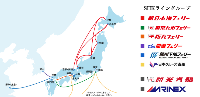 | SHKライングループのネットワークを駆使し、日本全国はもちろん、中国や韓国へも安全で低コストな 海陸一貫輸送をトータルプロデュース致します。 |