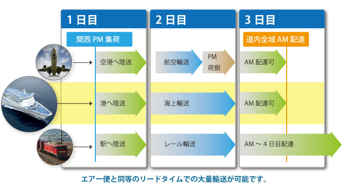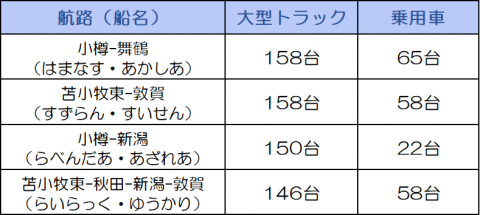 当社が所有する超高速フェリーは、関西~北海道間を約21時間、新潟~北海道間を約16時間で運航するため、 |