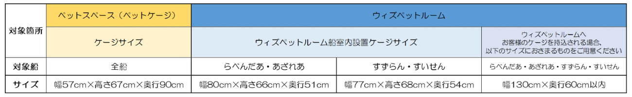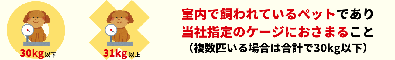 利用規約抜粋2 – ご乗船いただくペットは、室内で飼われているペット(30kg以下)であり当社指定のケージサイズにおさまる大きさであることが条件です。