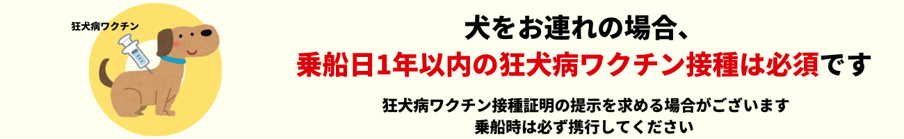 なおご確認のため、狂犬病ワクチン接種証明の提示を求める場合がございます。乗船時は必ず携行いただきますようお願いいたします。