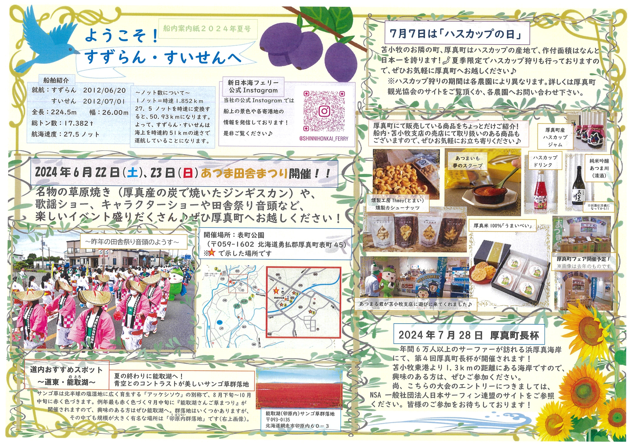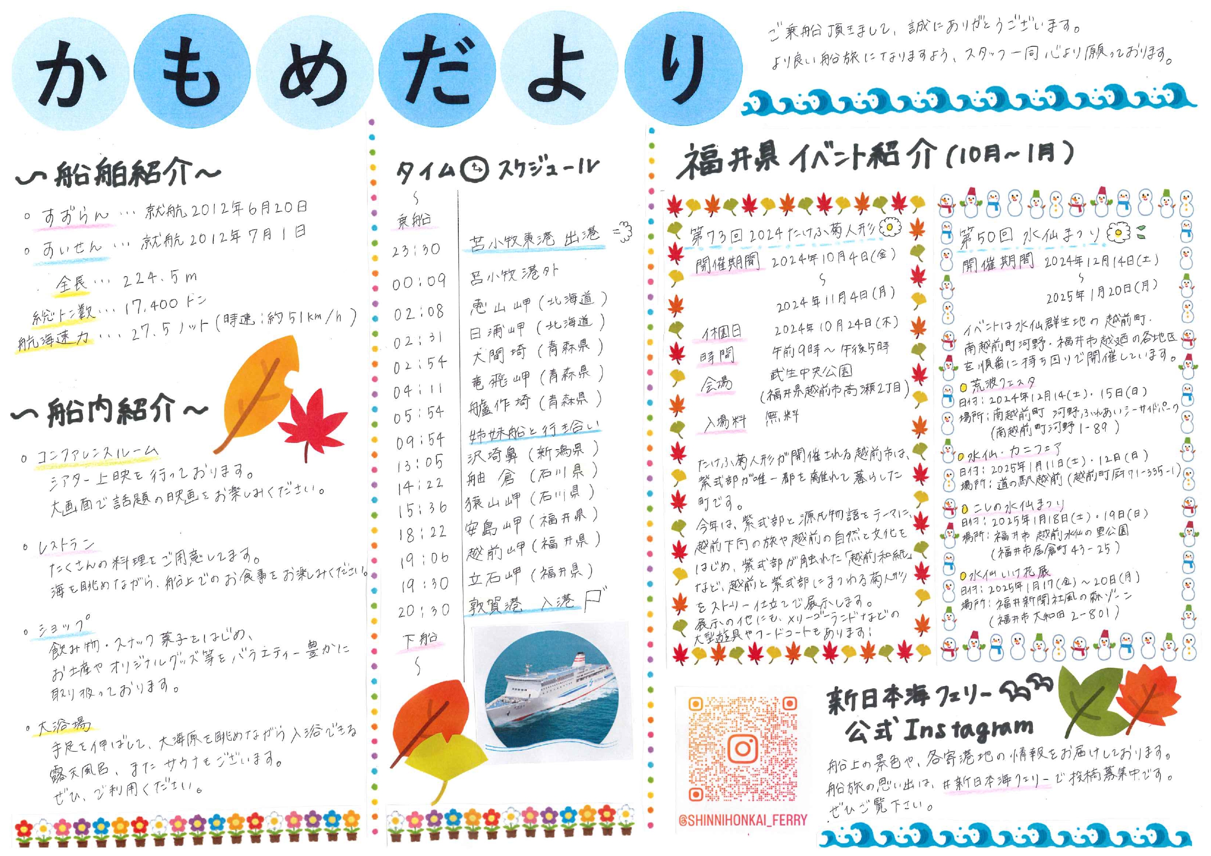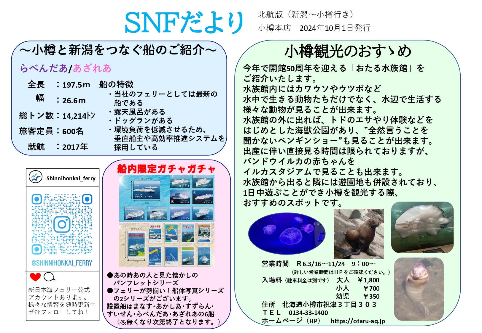ホーム 船舶 けやき/あかしあ すずらん/すいせん らべんだあ/あざれあ らいらっく/ゆうかり 全ての船舶 ▲ ▼ 船旅案内紙 2020/2/20 舞鶴→小樽かもめだより 小樽フェリーターミナルより小樽のおすすめスポットをご紹介します♪ 詳細へ 新潟→小樽 かもめだより 小樽フェリーターミナルより小樽のおすすめスポットをご紹介します♪ 詳細へ 敦賀・新潟・秋田→苫小牧かもめだより 秋田フェリーターミナルより寄港地のおすすめスポットをご紹介します♪ 詳細へ 苫小牧→秋田・新潟・敦賀かもめだより 秋田フェリーターミナルより寄港地のおすすめスポットをご紹介します♪ 詳細へ 小樽→新潟かもめだより 新潟フェリーターミナルより新潟のおすすめスポットをご紹介します♪ 詳細へ 苫小牧→敦賀かもめだより 敦賀フェリーターミナルより福井のおすすめスポットをご紹介します♪ 詳細へ 小樽→舞鶴かもめだより 舞鶴フェリーターミナルより京都のおすすめスポットをご紹介します♪ 詳細へ 敦賀→苫小牧かもめだより 苫小牧東フェリーターミナルより北海道のおすすめスポットをご紹介します♪ 詳細へ