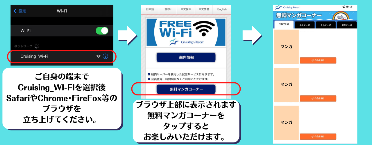 ご自身のスマホで乗船中に人気の漫画が楽しめます♪